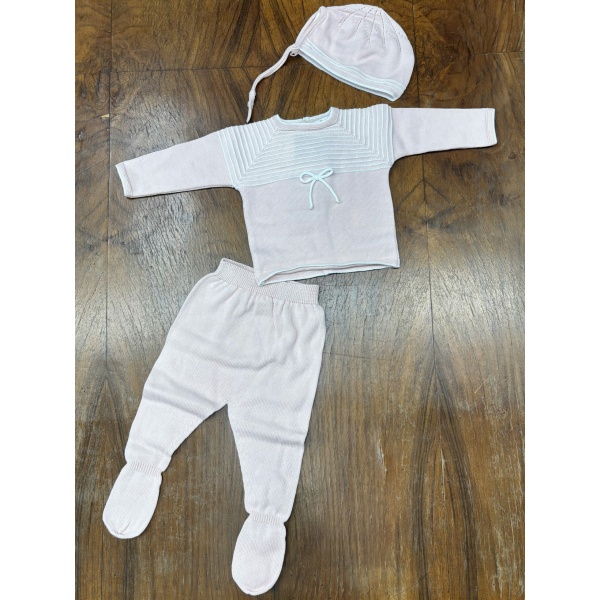 Completo Baby Dif in cotone 3 pezzi: t-shirt a maniche lunghe, pantaloni con piedino e cappellino.