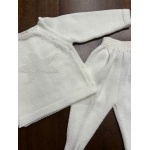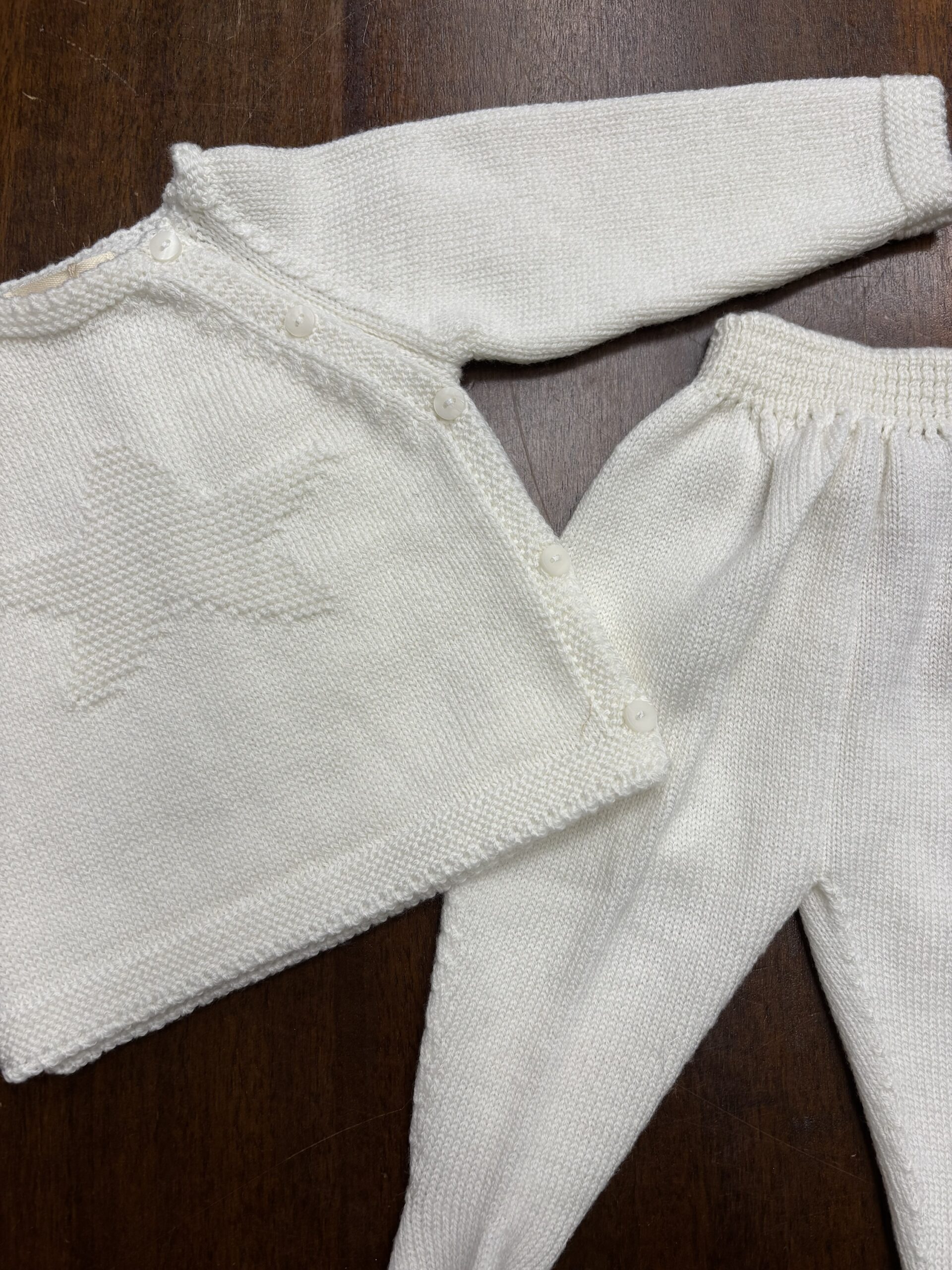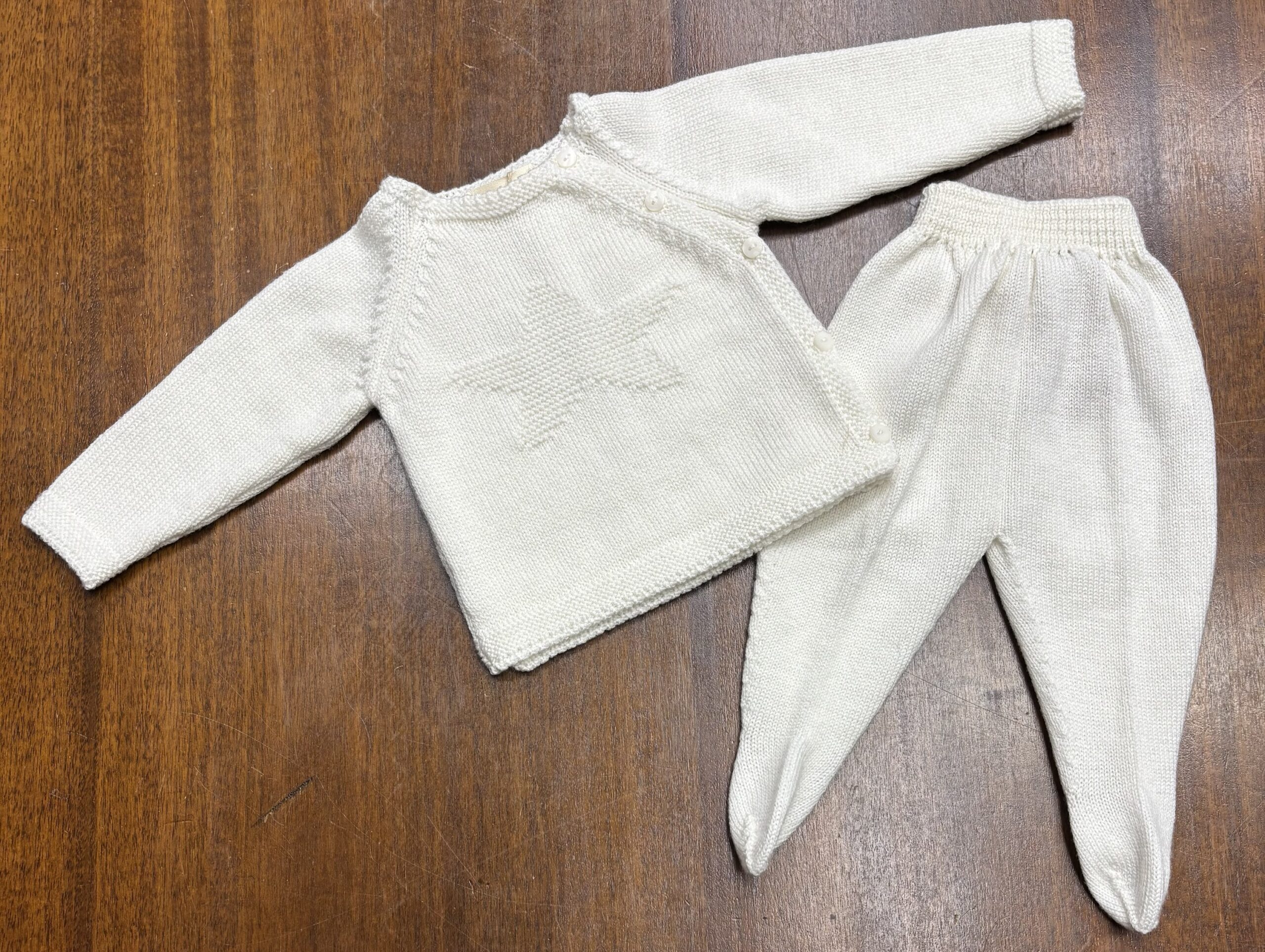 Completo Mi Lucero in lana 2 pezzi: maglia con bottoni, pantaloni con piedini ed elastico in vita.