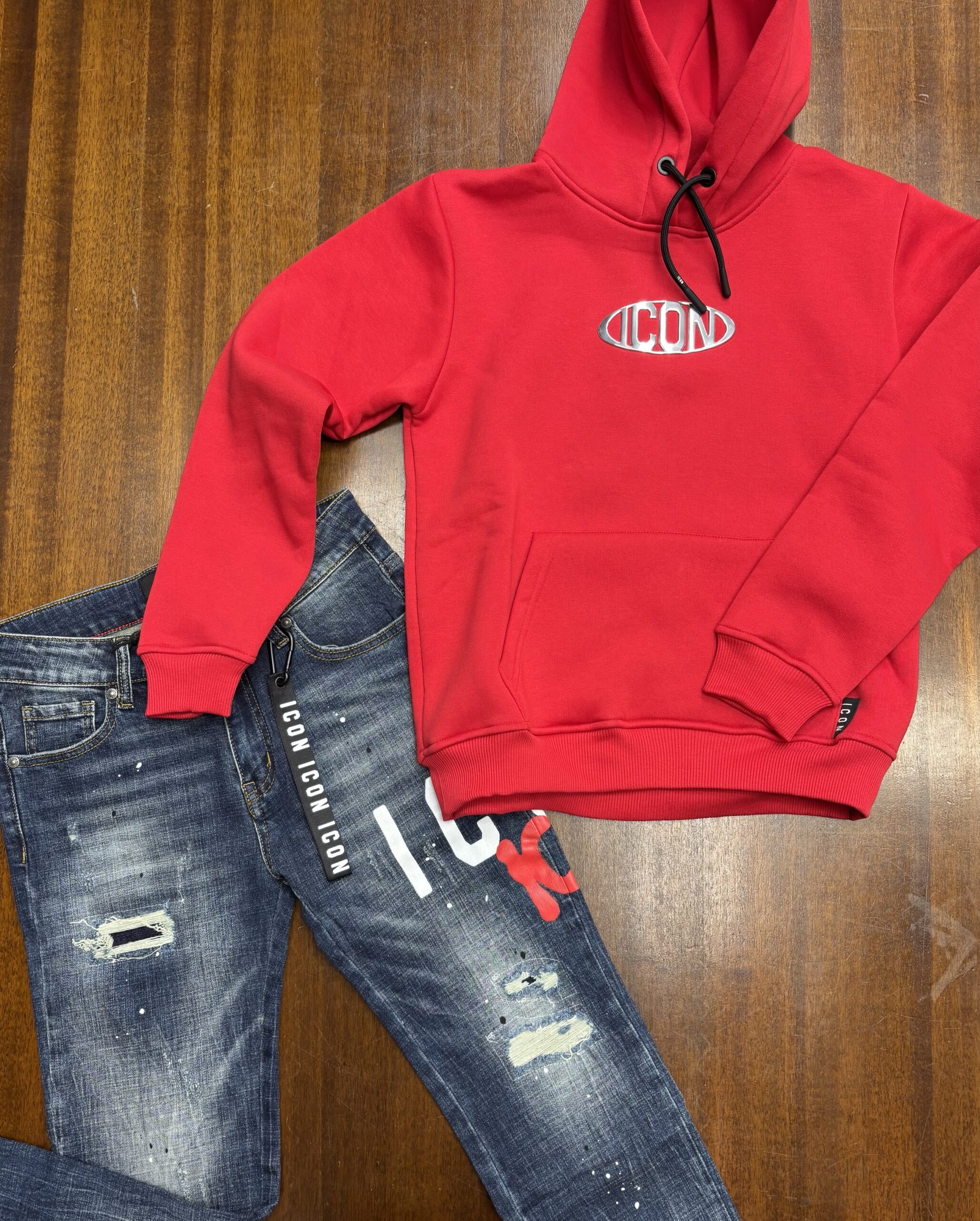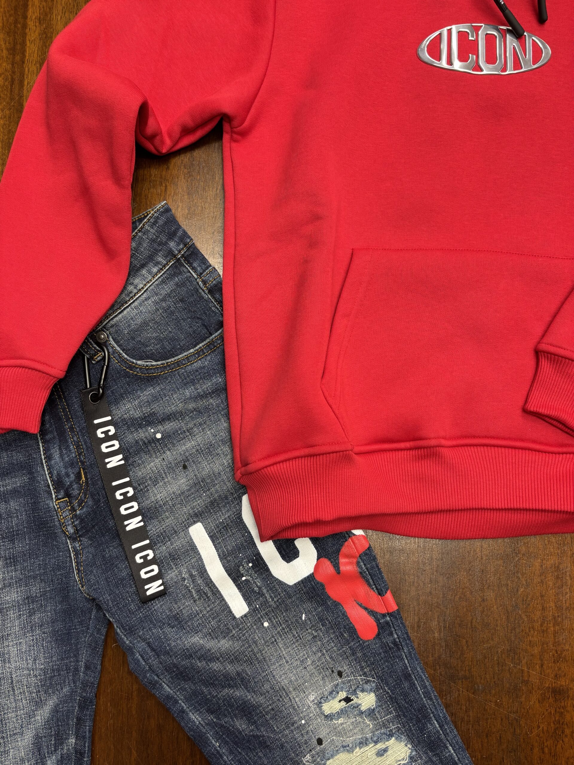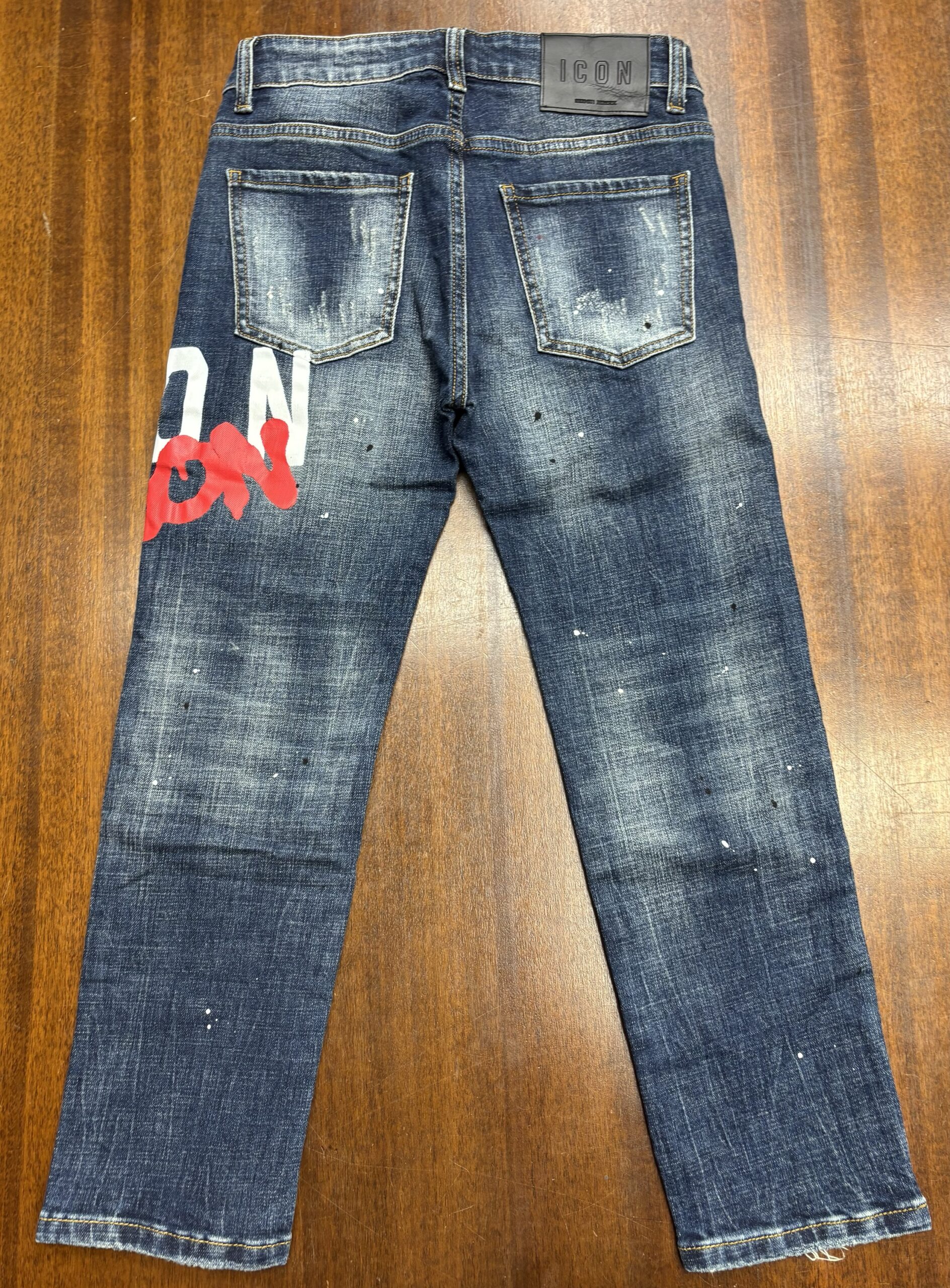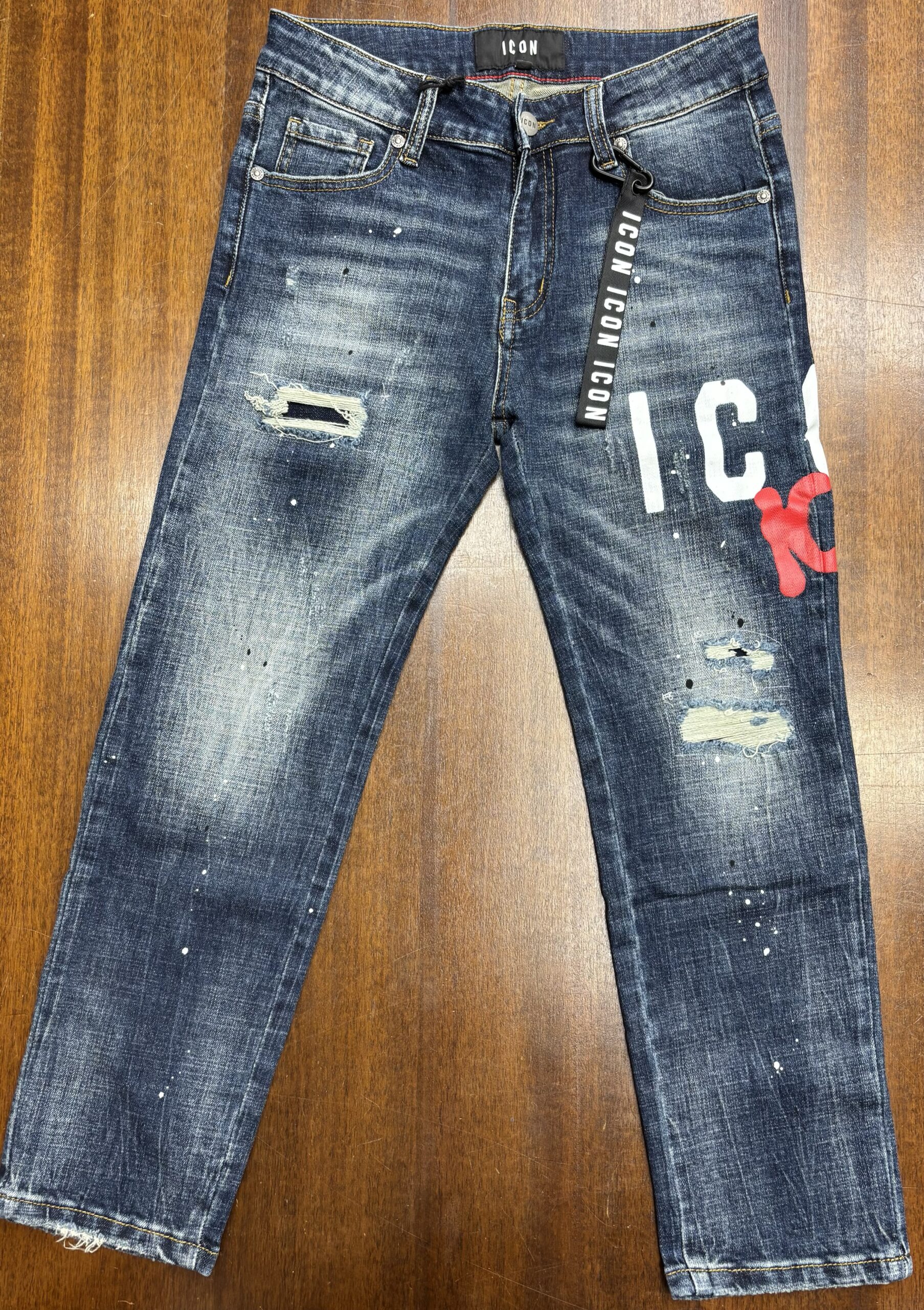Jeans ICON con strappo e scritta, regolabili in vita.