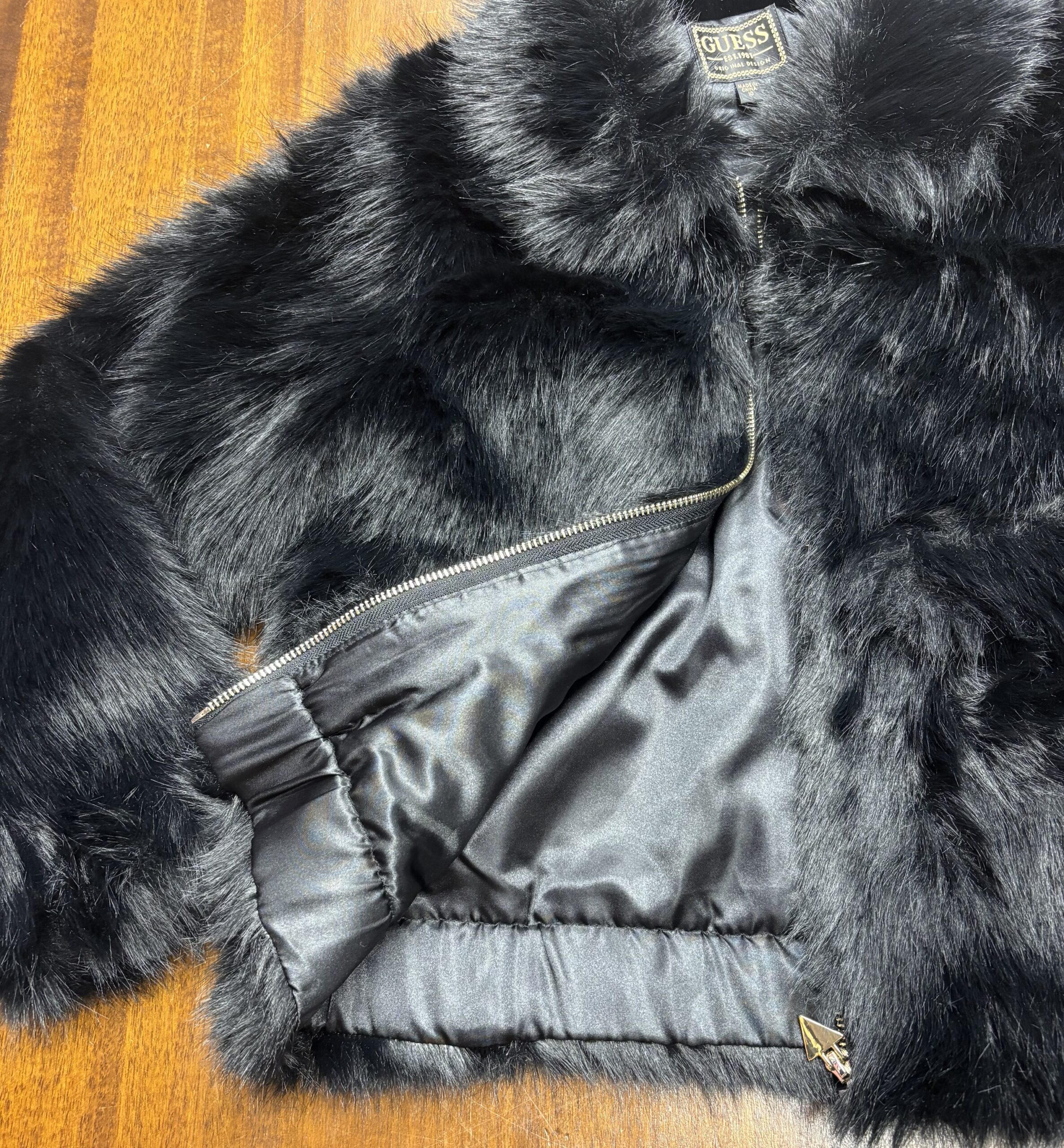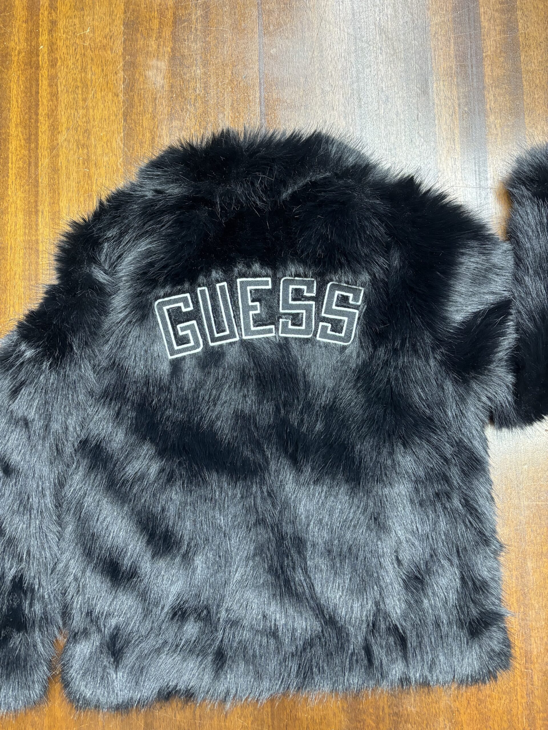 Pelliccia Guess senza cappuccio con scritta sul retro.